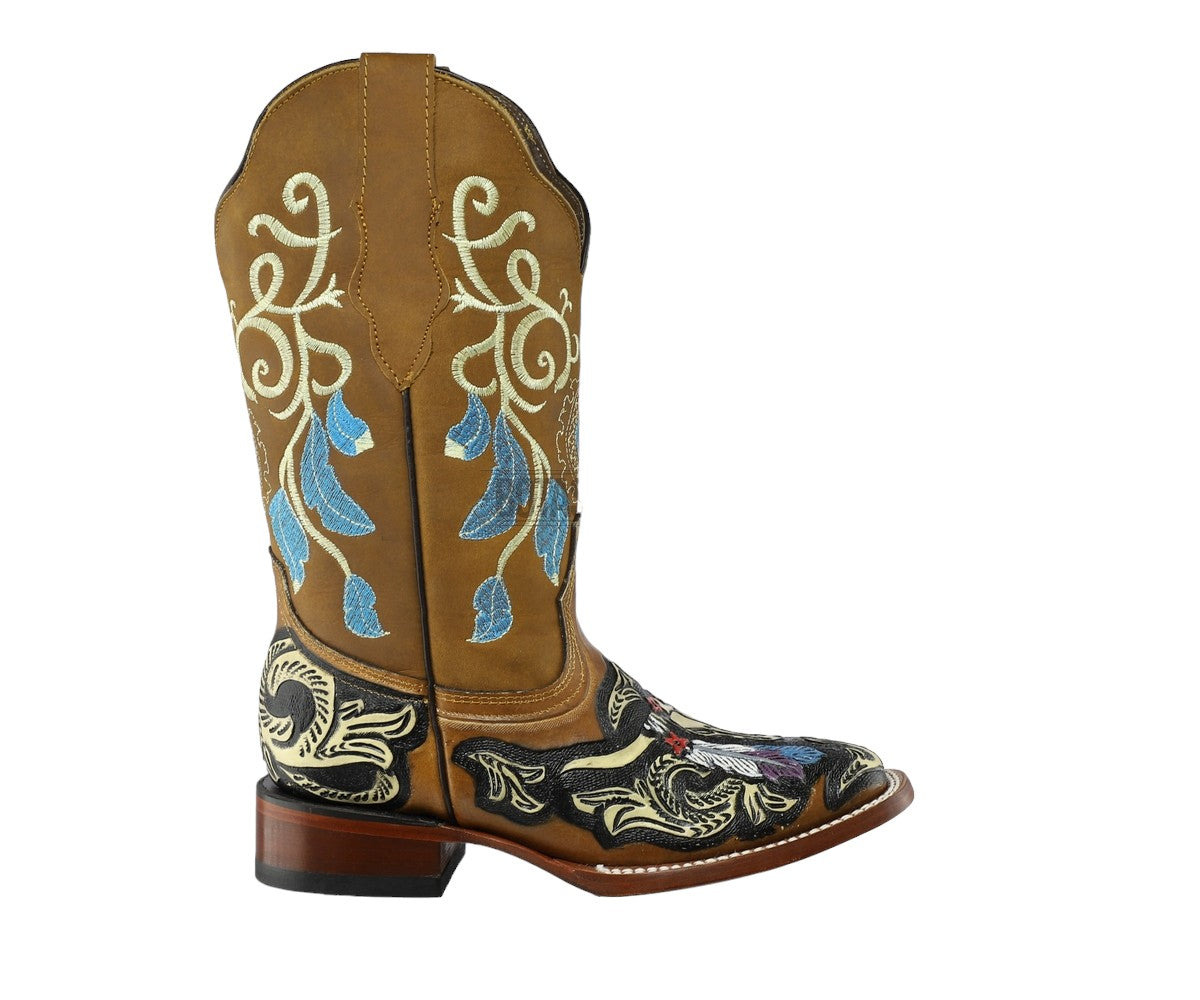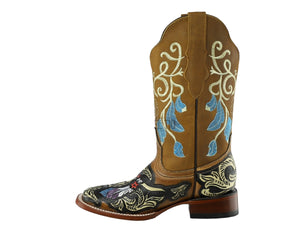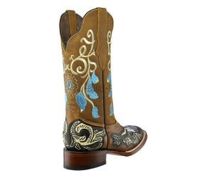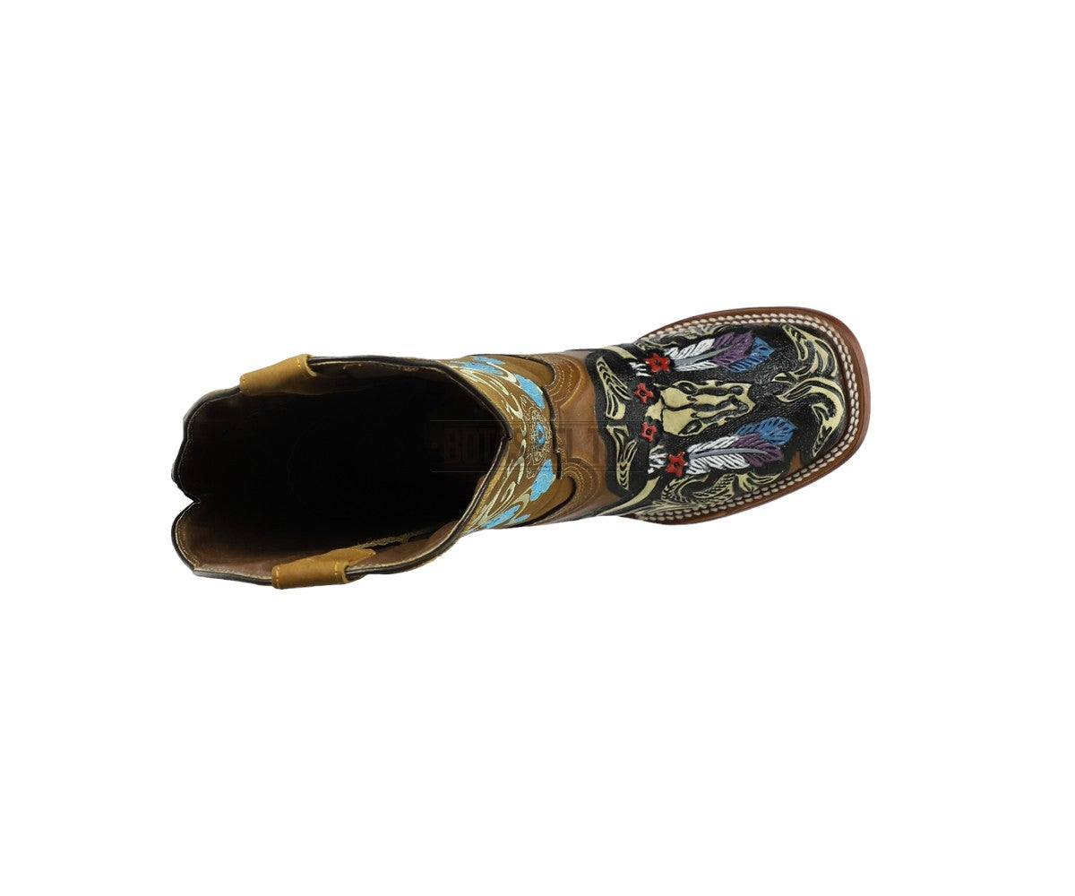 El diseño de craneo en la parte frontal, combinado con patrones florales cincelados a mano en tonos vibrantes de azul y beige, convierte a estas botas en una verdadera obra de arte. Además, su tubo alto ofrece un acabado espectacular con bordados que no pasarán desapercibidos.