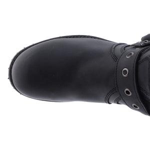 Este modelo incorpora casco de acero en la punta para mayor seguridad, junto con una suela tractor de hule antiderrapante que brinda agarre confiable en cualquier superficie. Además, cuenta con cierre lateral metálico para ponerlas y quitarlas fácilmente, sin perder estabilidad, y una correa con herraje decorativo Liberty que refuerza el estilo motociclista clásico.