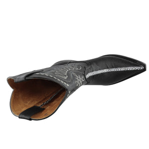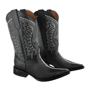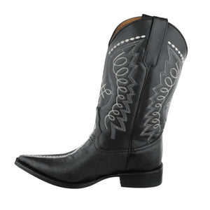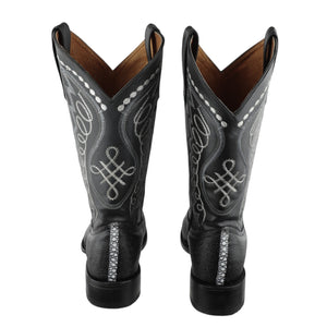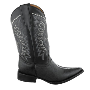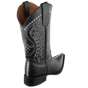 Estas botas vaqueras para hombre destacan por su diseño único con imitación piel de mantarraya en elegante color negro. Fabricadas cuidadosamente con finos detalles bordados y acabado texturizado brillante que realzan su estilo audaz y auténtico. Punta clásica puntal que aporta sofisticación, ideales para cualquier ocasión donde quieras reflejar fuerza y presencia western. Hechas orgullosamente en México con la más alta calidad.