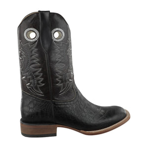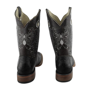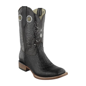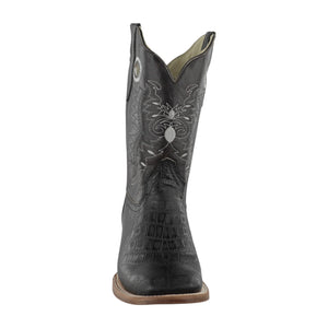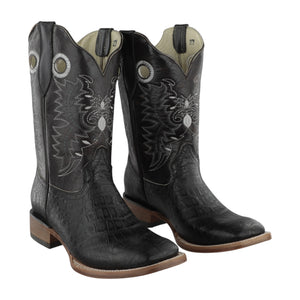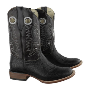 Luce con estilo y carácter con estas botas vaqueras para hombre, elaboradas en piel de res genuina grabada con diseño tipo nuca de cocodrilo. Su elegante color negro y el bordado artesanal en el tubo reflejan la tradición y fuerza del estilo western. La suela de vaqueta brinda mayor durabilidad, mientras que el tacón de hule proporciona tracción y comodidad al caminar. Su horma Bulldog y estructura firme las hacen ideales para el uso diario o para destacar en cualquier ocasión. Hechas orgullosamente en México con acabados de primera calidad.