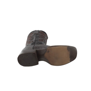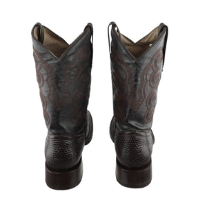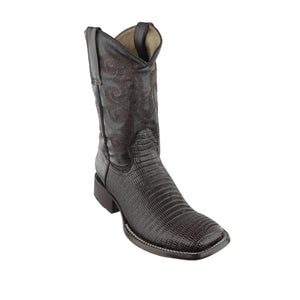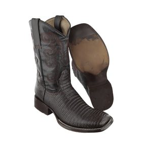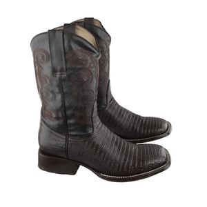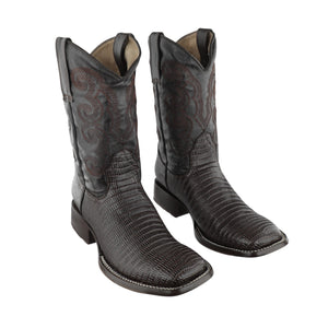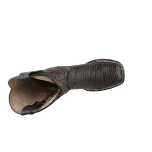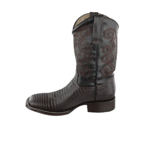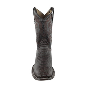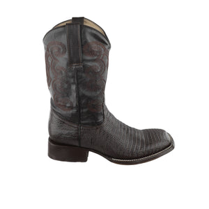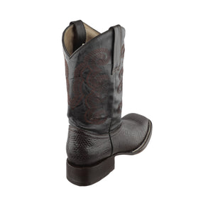 Estas botas vaqueras están confeccionadas en piel de res grabada con textura tipo lizard, brindando un look exótico, elegante y resistente. Su color café profundo y el bordado artesanal en el tubo las hacen destacar por su sobriedad y estilo clásico. La horma Bulldog proporciona un ajuste cómodo y firme, ideal para quienes buscan presencia y confort. Equipadas con suela de cuero natural, estas botas son ideales tanto para uso diario como para eventos especiales. Hechas con orgullo en México.