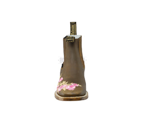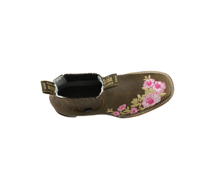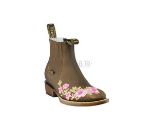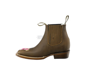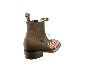 Botín Charro para Dama de la marca Botas El Tío fabricado en piel genuina. Este botín en tono tabaco destaca por su diseño clásico y elegante, complementado con un bordado de flores en tonos rosados y beige en la parte frontal, aportando un toque femenino y distintivo. La forma de la punta es estilo francesa, lo que brinda una apariencia sofisticada y estilizada. Cuenta con un tacón cuadrado de vaqueta, ideal para mayor estabilidad y comodidad.