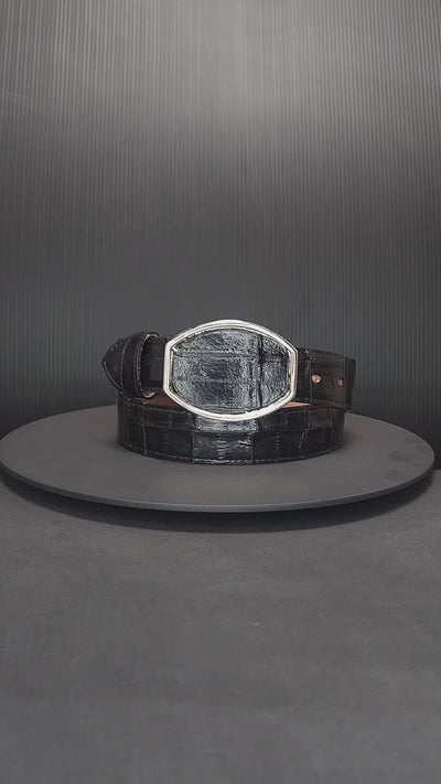 El Cinturón de piel de anguila negro con hebilla plateada es un accesorio exclusivo que combina lujo, elegancia y estilo vaquero auténtico. Elaborado con piel de anguila original, este cinturón ofrece un acabado brillante con textura natural en rombos, lo que lo convierte en un cinturón exótico para hombre único y sofisticado.